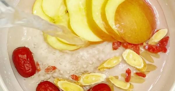 Chuẩn bị: Một quả táo tươi bỏ lõi và cắt thành từng miếng (có thể bỏ vỏ hoặc để nguyên, tùy theo sở thích cá nhân); 5 quả táo đỏ (táo khô) cắt đôi (nhớ bỏ hạt, nếu không sẽ gây nóng bên trong); một nắm quả kỷ tử.